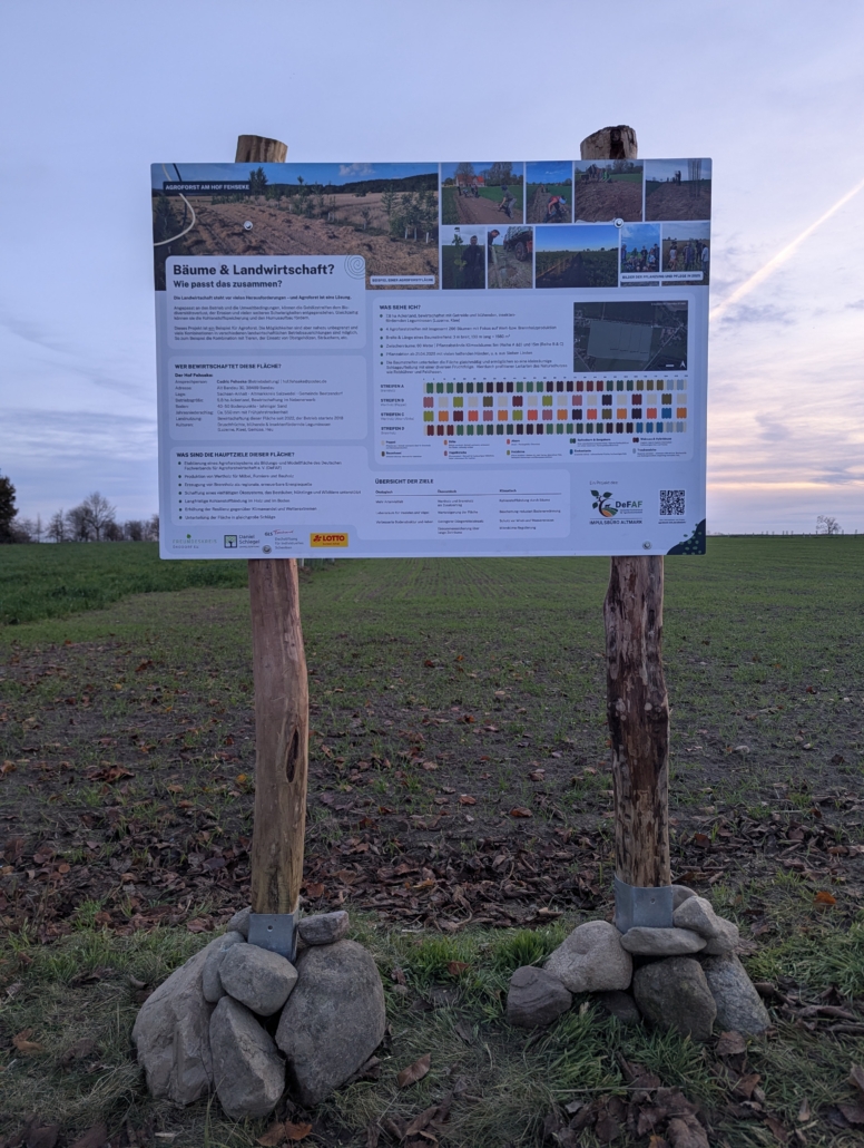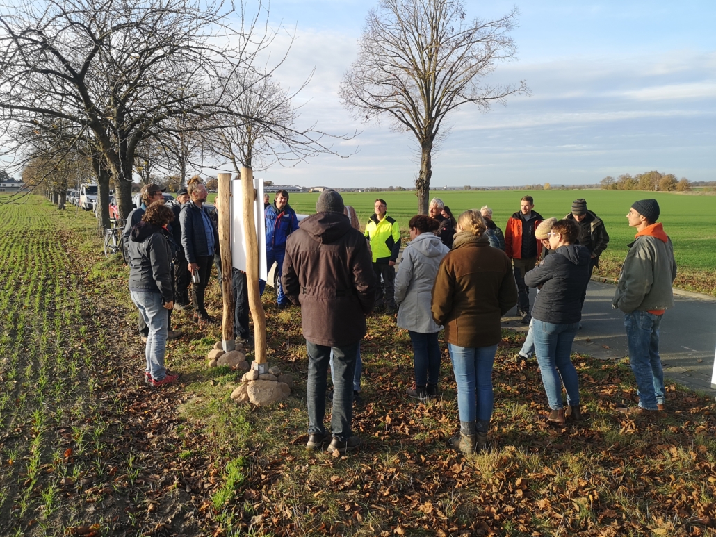 Nach der Mittagspause hieß es: Raus ins Feld! Wir besichtigten die im Frühjahr angelegte Modellfläche des DeFAF-Impulsbüros in Bandau. Gut gelegen an einer Straße (Querland, Bandau) kann nun jede:r Interessierte die Veränderungen weiter beobachten. In kleinen Runden tauschten wir uns auf dem Acker zu Meinungen, offenen Fragen und Erfahrungen aus.