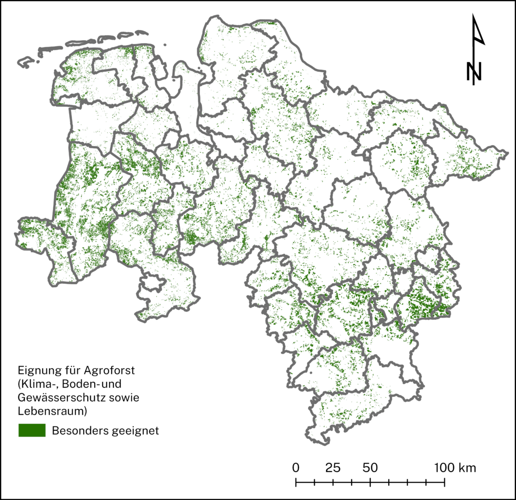 Im dritten Baustein „Potenzialanalyse für Agroforstsysteme in Niedersachsen“ präsentierte Dr. Penka Tsonkova ausgewählte Ergebnisse der Potenzialanalyse. Die Analyse zeigt, dass in Niedersachsen sowohl auf Acker- als auch auf Grünlandflächen erhebliche Potenziale für die Etablierung von Agroforstsystemen bestehen. So können Agroforstsysteme beispielsweise gleichzeitig einen Beitrag zum Klima-, Boden- und Gewässerschutz leisten sowie zur Aufwertung des Lebensraums in strukturarmen Agrarlandschaften beitragen. Insgesamt betrifft dies rund 516.000 ha Ackerland in Niedersachsen. Die Veröffentlichung des Berichts ist in Kürze geplant.