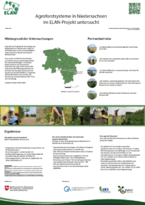 Innerhalb des Projektes ELAN erfolgte eine Evaluierung von Chancen und Hürden für die Etablierung und die Leistungsfähigkeit unterschiedlicher Agroforstsysteme in Niedersachsen (im Alley-Cropping-Design) . Dabei werden die Flächen auf fünf Partnerbetrieben wissenschaftlich untersucht, die bis 2023 ein Agroforstsystem etabliert haben. Hier finden Sie den Projektflyer mit weiteren Informationen und einem Kurz-Portrait der Partnerbetriebe.