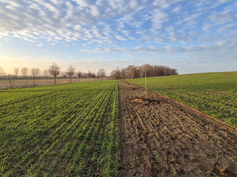 Auf dem Feldtag in Betzin bei der Agrargenosschenschaft „Ländchen Bellin“ wird eines von drei Agroforstsystemen vorgestellt, welches im Rahmen des EIP-Projekts „Roots & Robots“ entstanden ist. Auf einer biologisch bewirtschafteten Fläche wurden im Dezember vergangenen Jahres 240 Esskastanien- und Walnussbäume im Alley Cropping Design gepflanzt. Das Agroforstsystem ist Teil eines wissenschaftlichen Versuchs der Hochschule für nachhaltige Entwicklung Eberswalde (HNEE), welche in Zusammenarbeit mit den Praxispartnern und der gemeinnützigen Klimapraxis gUG untersucht, wie eine erfolgreiche Etablierung von Agroforstsystemen gelingen kann. Zusammen mit der Zauberzeug GmbH wird im Projekt zudem ein autonomer Roboter für die Pflege von Agroforstsystemen entwickelt.