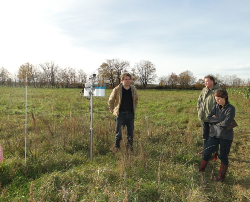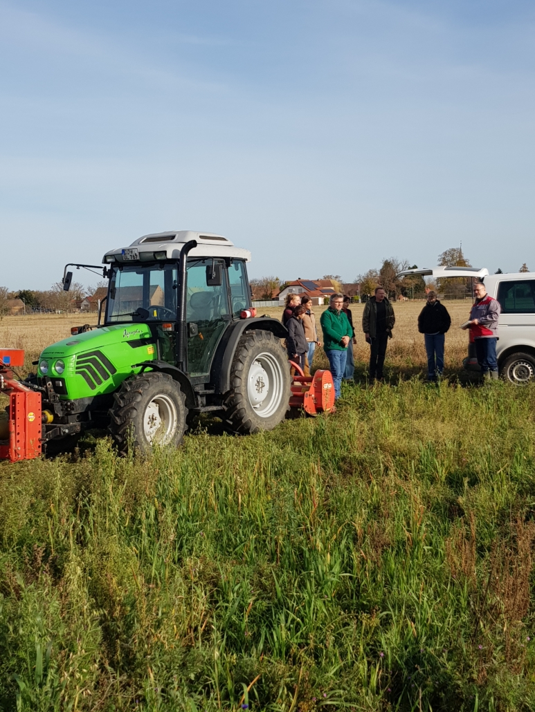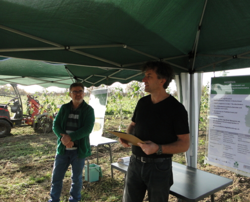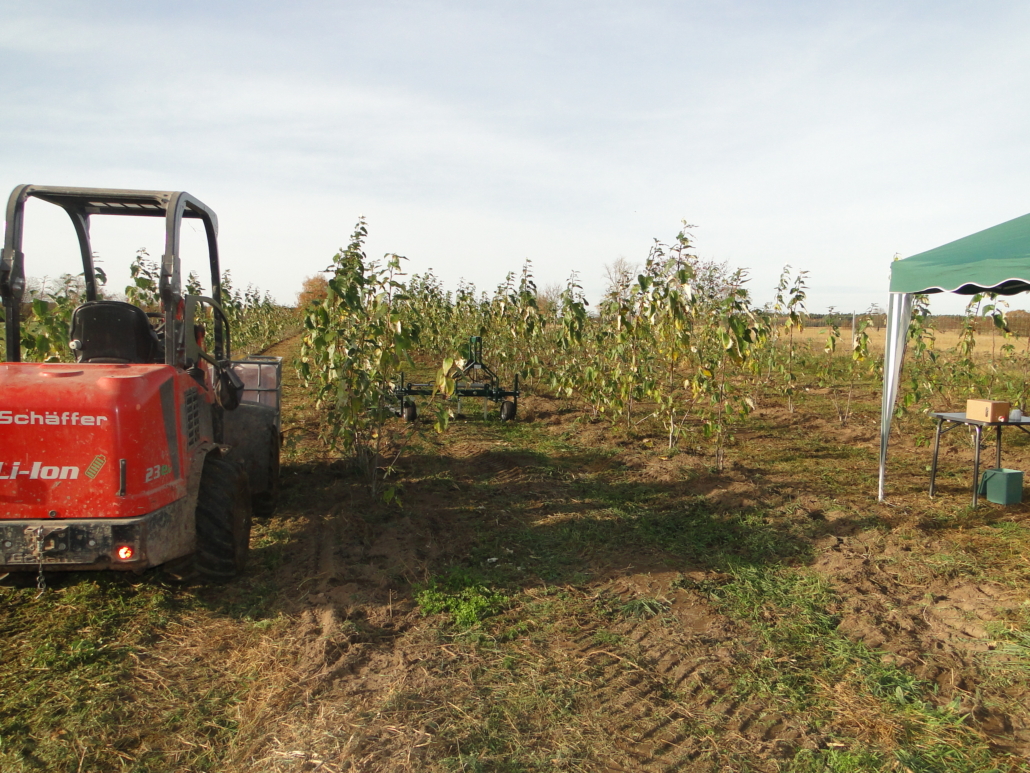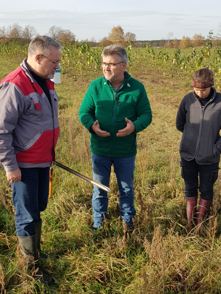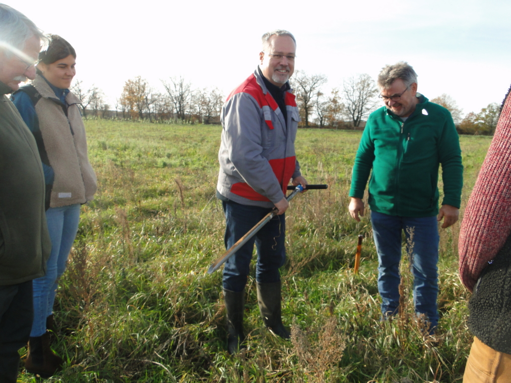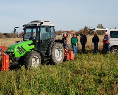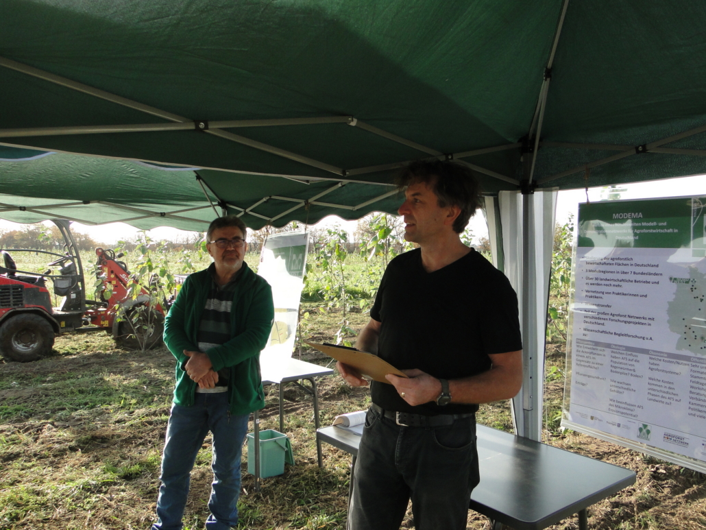 Im Projekt MODEMA koordiniert das Sächsische Landesamt für Umwelt, Landwirtschaft und Geologie (LfULG) die Modellregion Ost und hat am 13. November 2025 einen Feldtag auf dem Agroforststandort von Landwirt Dirk Barthel organisiert. Durch das Ökokompetenzzentrum des LfULG wurden Maschinen und Praktiken zur Pflege der jungen Baumstreifen vorgeführt, insbesondere Geräte aus dem Obstbau und der Kommunaltechnik. Die Untersuchungen der Bodencharakteristik mittels Erdbohrstock (Pürckhauer) geben wichtige Hinweise zur Wasserhaltefähigkeit des Bodens und wurden vom Deutschen Wetterdienst (DWD) vorgestellt.
