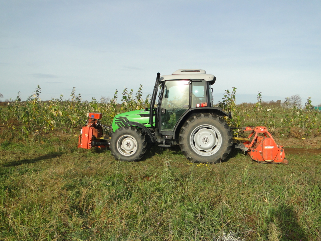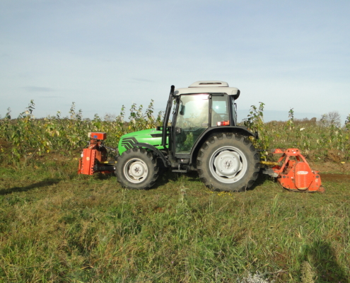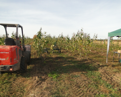 Maschinenschau entkrauten, mulchen, wässern im Agroforstsystem.
