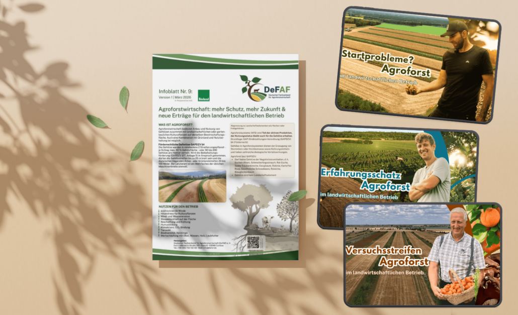 Dr. Steffi Schillem (DeFAF e. V.) und Tobias Hoppe (Bioland Praxisforschung GmbH) adressieren mit dem jetzt neu veröffentlichten Infoblatt vor allem Landwirtinnen und Landwirte, die sich mit der Frage beschäftigen, ob und wie Agroforst zu ihrem Betrieb passt. Beide Autoren sind im Projekt MODEMA tätig. Das vom DeFAF e. V. getragene Projekt MODEMA verfolgt das Ziel, Agroforstsysteme als zukunftsfähige Landnutzungsform in Deutschland zu etablieren und praxisnahes Wissen für Betriebe bereitzustellen. Mit dem neuen Info-Bundle wurden grundlegende Informationen, wirtschaftliche Eckdaten und rechtliche Hinweise in einem leicht zugänglichen Format aufbereitet.