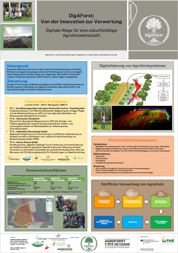 Ziel des Modell- und Demonstrationsvorhabens ist die Etablierung von Agroforstsystemen in der Agrarintensivregion Nordwestniedersachsen und deren digitale Kartierung und Inventarisierung durch KI-gestützte Robotertechnik. Anhand der erfassten Daten sollen Bewirtschaftung und Erntezeitpunkt optimiert und damit eine verbesserte stoffliche Verwertung in der Holzverarbeitung garantiert werden. So soll eine geschlossene Wertschöpfungskette entstehen, die regional und nachhaltig ist.