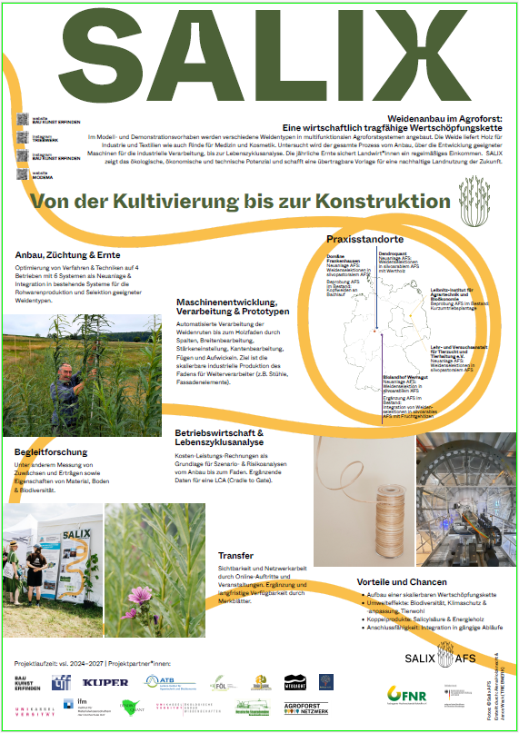 Ziel des Modell- und Demonstrationsvorhabens ist die Etablierung und nachhaltige Produktion geeigneter Weidenarten in multifunktionalen Agroforstsystemen. Das Weidenholz wird zur Weiterverarbeitung für einen endlosen Weidenholzfaden und für Weidenholztextil genutzt. Das Weben und Flechten mit einem Massivholzfaden ist eine neue und wenig erforschte Herangehensweise für die industrielle Formgebung von Holzbauteilen. Aus der Weidenrinde werden Salizylate für Medizin & Kosmetik gewonnen. Die jährliche Ernte garantiert bereits kurzfristig gesicherte Einnahmen für die Landwirtschaftsbetriebe und steigert den Anreiz für die Realisierung in der Praxis.