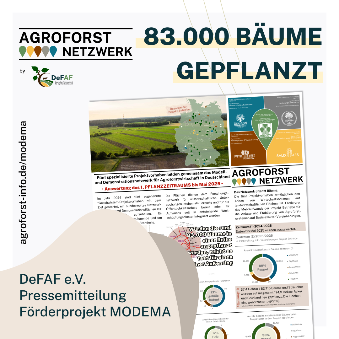 Das Verbundvorhaben MODEMA ermöglicht eine Übertragung auf möglichst viele Standorte und setzt Agroforstwirtschaft in der Fläche um. Die Zusammenarbeit aller Vorhaben im deutschlandweiten AGROFORST-NETZWERK sichert eine enge Verzahnung und Abstimmung und eine durchsetzungsstarke Öffentlichkeitsarbeit.