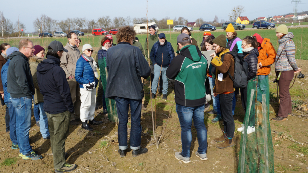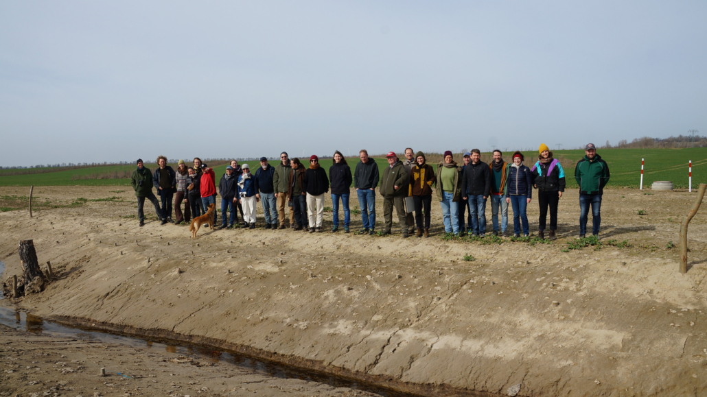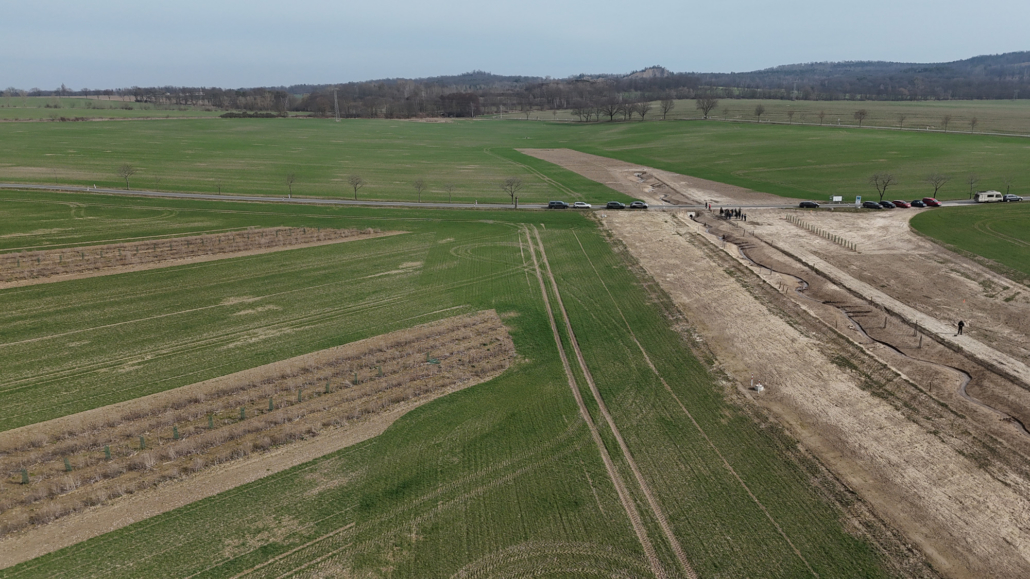 Danach besichtigten die Teilnehmenden das direkt an die Agroforstfläche der Böhlitzer Agrar e. G. anschließende Gewässer-Renaturierungsprojekt „Tauchnitzgraben“. In Kooperation zwischen Wasser- und Landwirtschaft wird ein ehemals verrohrter landwirtschaftlicher Graben freigelegt, seinem natürlichen Lauf zugeführt und von diversen Agroforstgehölzen rechts und links beschattet werden. Im Rahmen des Projekts soll der Anlage von Agroforstsystemen entlang von Gewässern und zur Erreichung der Ziele der EU-Wasserrahmen-Richtlinie mehr Aufmerksamkeit geschenkt werden.